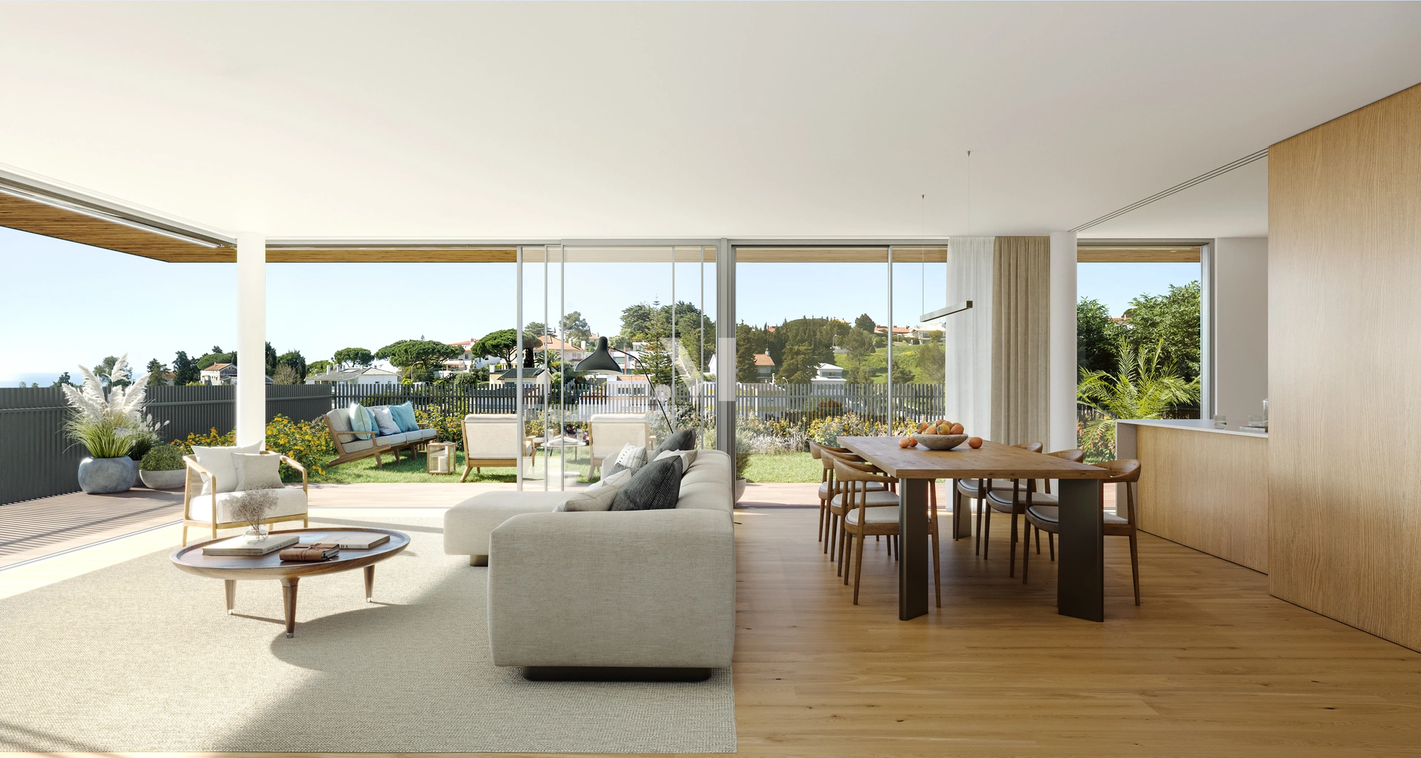The introduction of elements of continuity, such as continuous flooring between the kitchen and living room, sliding doors, and large glass windows giving access to the outside spaces, allow for the creation of truly harmonious spaces.