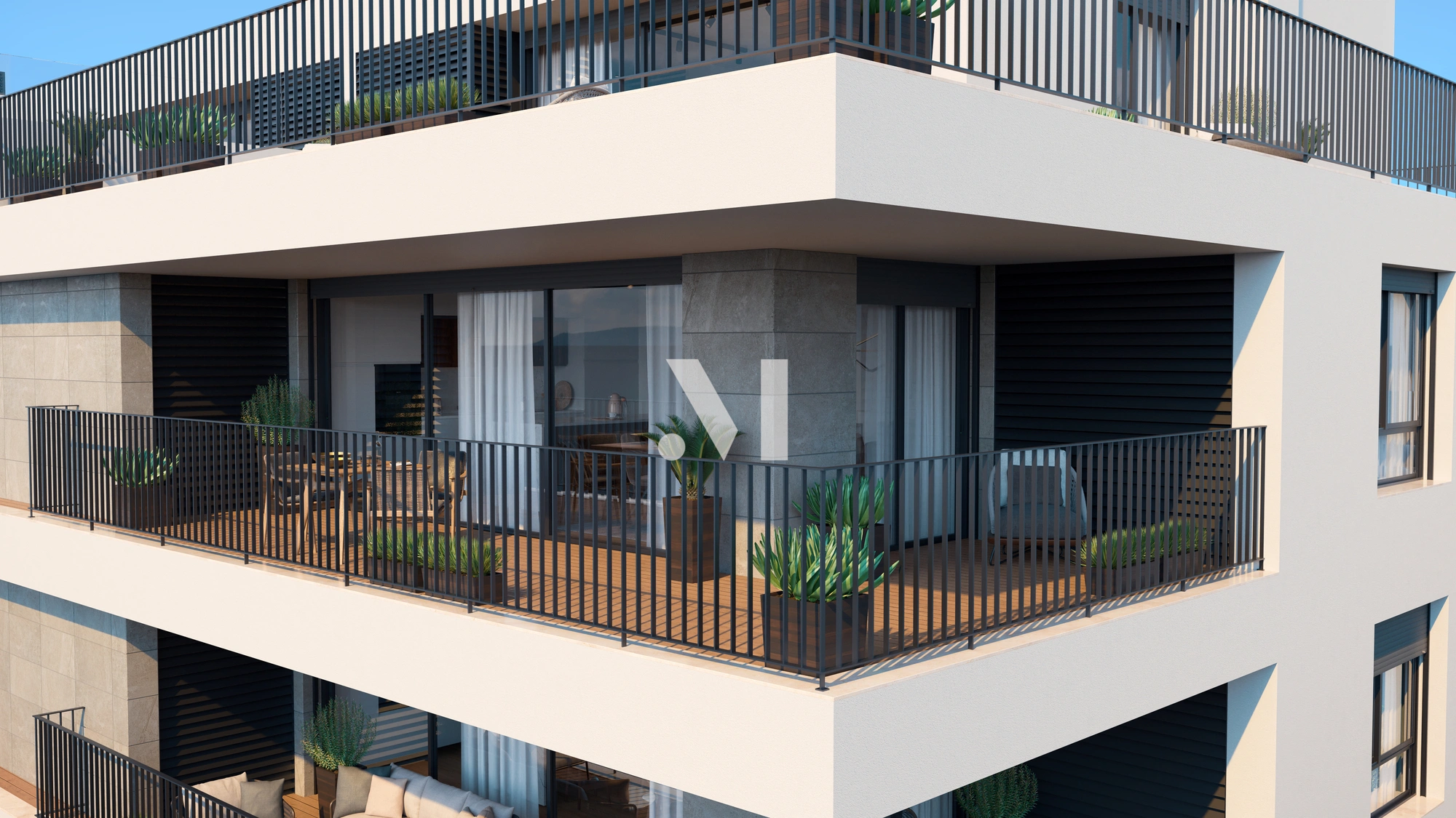 De vastes balcons et terrasses créent des environnements fonctionnels et harmonieux, complétés par des cuisines modernes avec îlots, équipées d’appareils électroménagers de qualité supérieure, et des finitions nobles telles que des sols en chêne naturel et des installations sanitaires contemporaines.